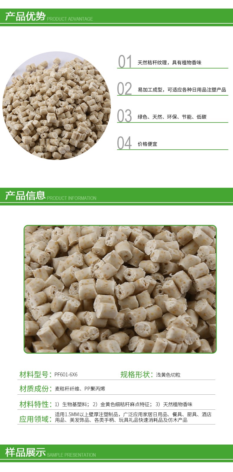 秸桿復(fù)合材料是由秸桿、稻殼、淀粉、竹粉、木粉等天然可再生植物纖維與離分子樹脂經(jīng)特殊工藝復(fù)合而成的新型綠色環(huán)保復(fù)合材料,具有與普通熱塑性塑料相關(guān)類似的性能,適用于各類注塑品加工。